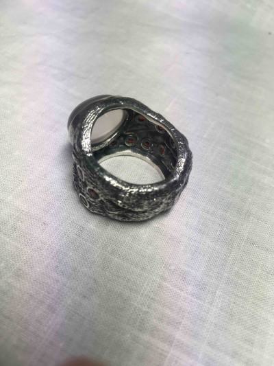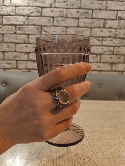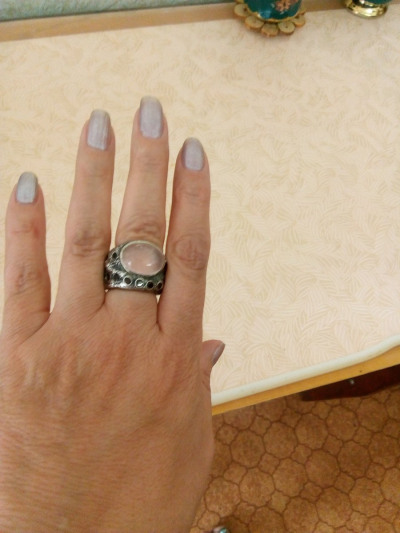 Крупный массивный перстень с большим розовым кварцем и гранатами. Можно одевать камнем наверх и вниз, смотрится по разному, но одинаково внушительно. По форме напоминает свернувшуюся змею. Кольцо объемное, к нему нужно привыкнуть. Мне этот перстень очень понравился.