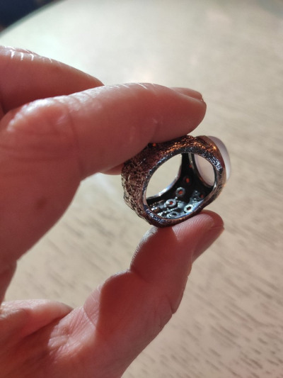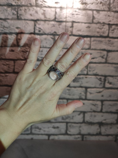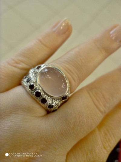 Очень рада, что удалось купить это роскошное кольцо в своем размере и с очень большой скидкой! От украшения глаз не оторвать, произведение искусства. Чистый прозрачно-розовый кварц плюс гранаты, каждый из которых закреплен под своим углом, создают постоянное мерцание и переливы света. Оправа как слепок каких-то природных форм, все очень органично смотрится. Можно носить как большим камнем к себе, так и от себя. Массивность кольца вначале кажется неудобной, но быстро привыкаешь. Нужно внимательно выбирать размер - за счет большой ширины может чуть маломерить, примерно на полразмера в моем случае.
