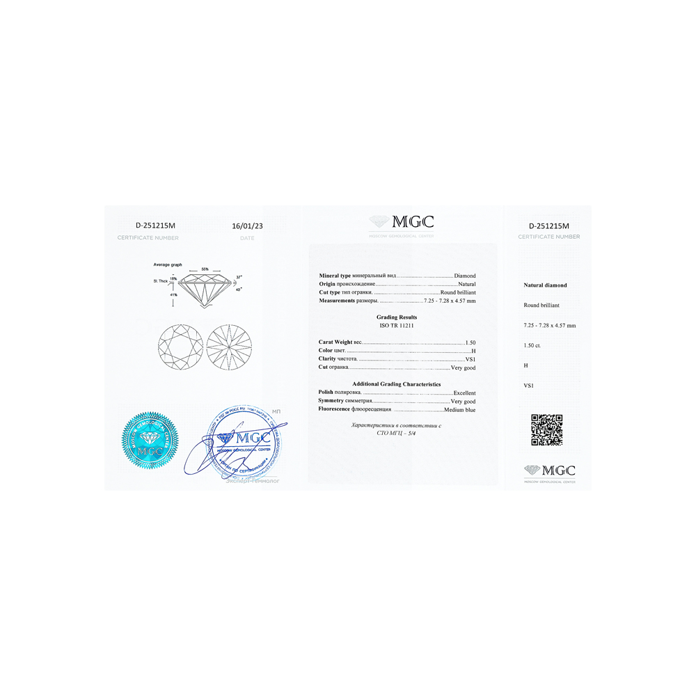 Кольцо с 1 бриллиантом природным, 1.5 карат, огранка круг 57 граней, цвет 5, чистота 4, тип огранки А;