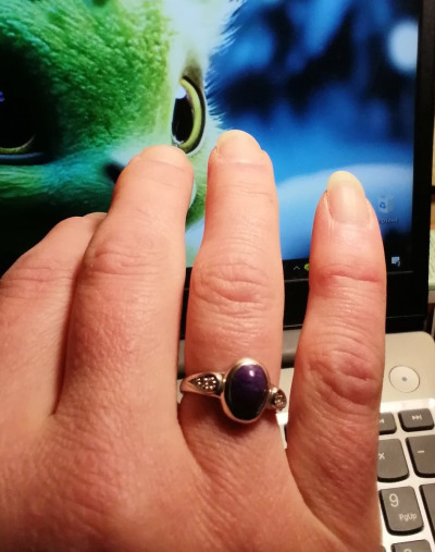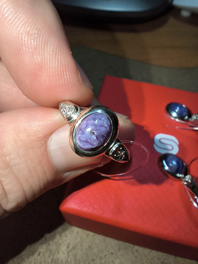 Колечко с настоящим волшебным камушком, чароитом. Камешек небольшой и обладает магическими свойствами, кому интересно- прочтите на сайте и в сети. В глаза украшение не бросается, скромное, минималистичное, как и положено всему магическому:) точно как на фото.
