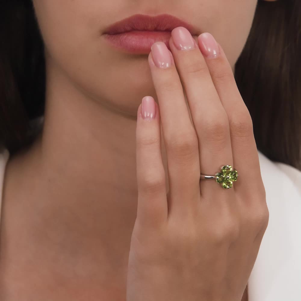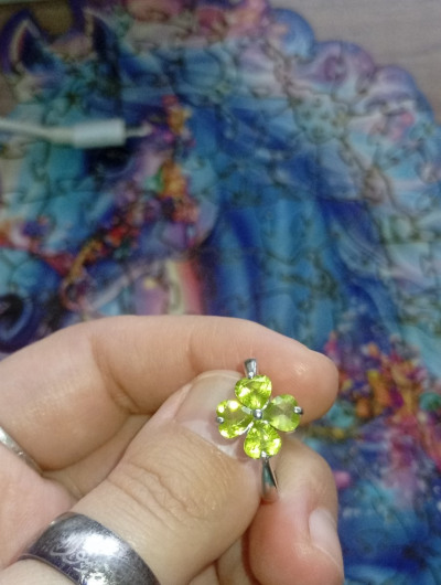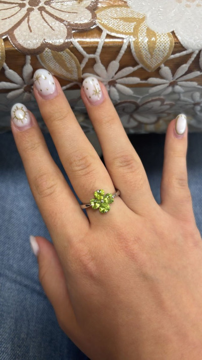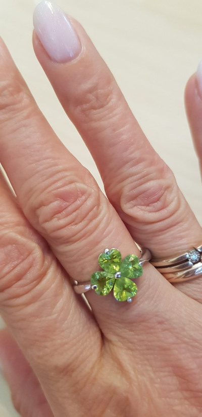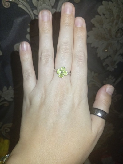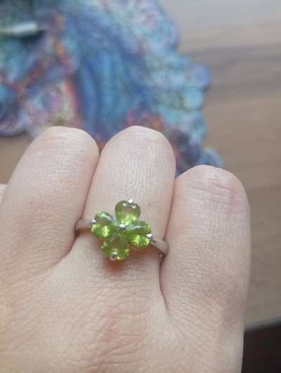 Четырёхлистный клевер из хризолита, кольцо. Веселый, чистый, играющий перидот = хризолит = оливин.