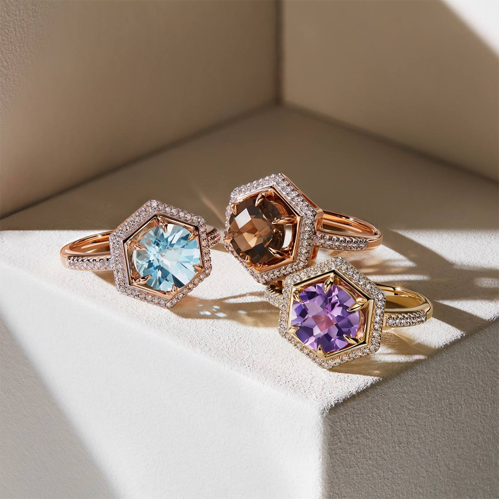Золотое кольцо с бриллиантами природными и кварцами дымчатыми природными