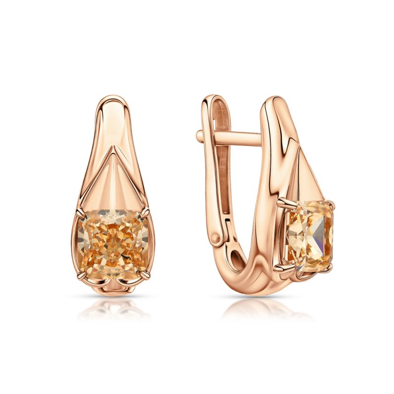 Серьги с 2 кварцами дымчатыми природными, 3.98 карат, тип огранки Б; 2 бриллиантами коньячными природными, 0.02 карат, огранка круг 57 граней, цвет 7, чистота 5, тип огранки А; 48 бриллиантами коньячными природными, 0.33 карат, огранка круг 57 граней, цвет 7, чистота 5, тип огранки А; 20 бриллиантами коньячными природными, 0.05 карат, огранка круг 57 граней, цвет 7, чистота 5, тип огранки А; Розовое золото 585 пробы.
