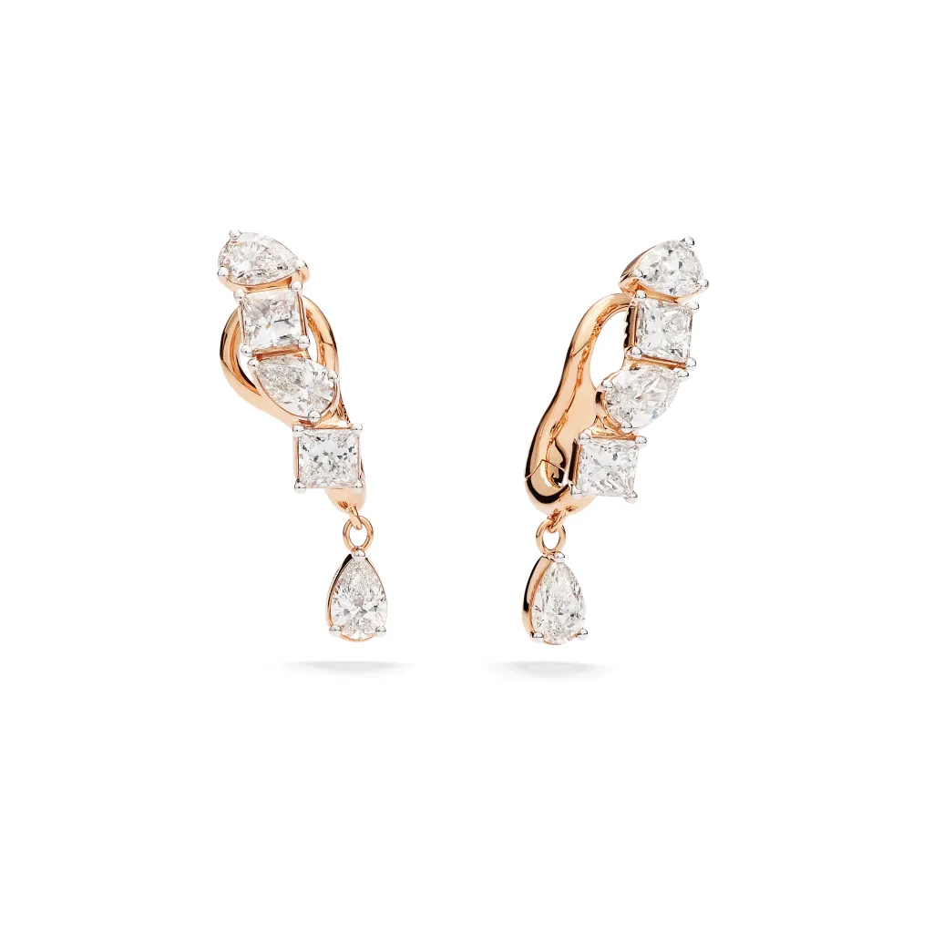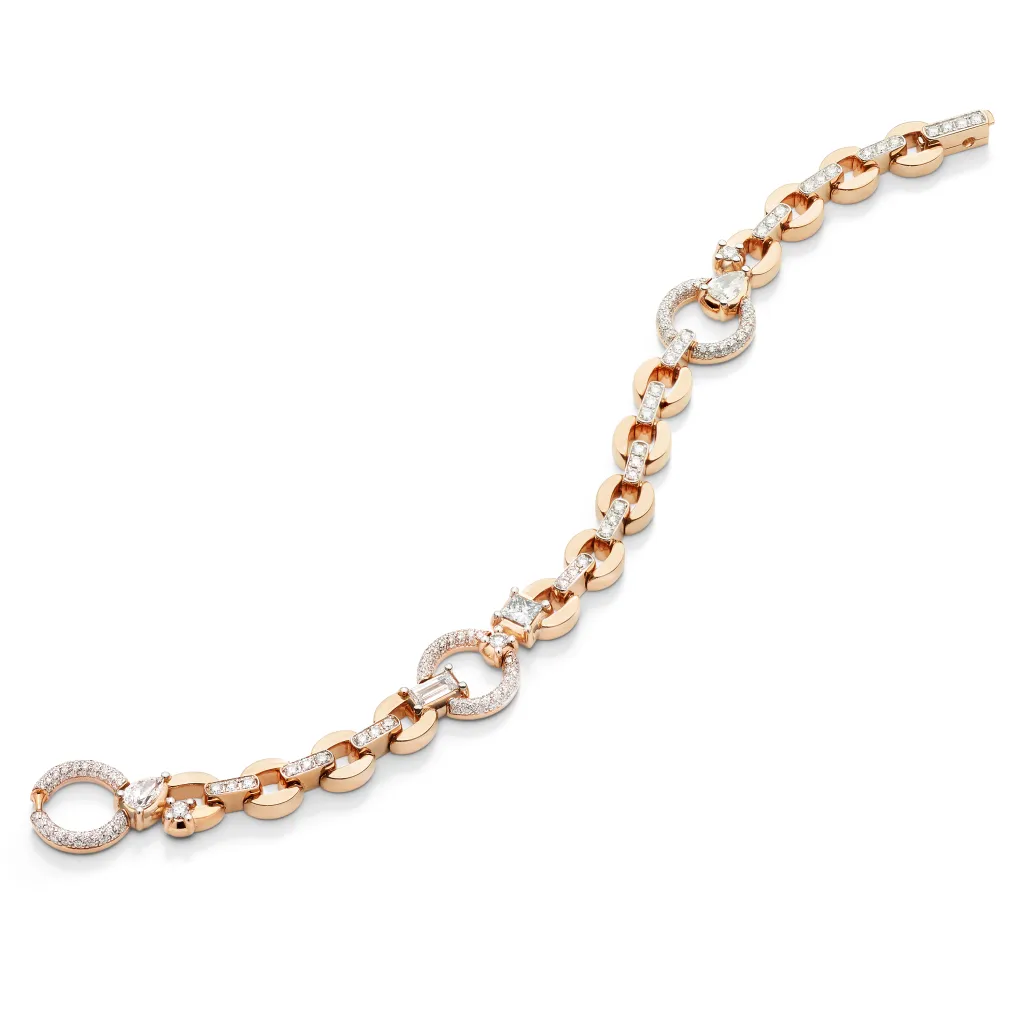 В основе коллекции — напряжение противоположностей. Тёплое розовое золото встречается с холодным сиянием камней, плавность фирменных цепей вступает в диалог с точной геометрией огранок. Бриллианты огранки «груша», «принцесса», «багет» и классической круглой формы выстраивают ритм, напоминающий фасады миланских палаццо, где строгая линия всегда смягчена игрой света.